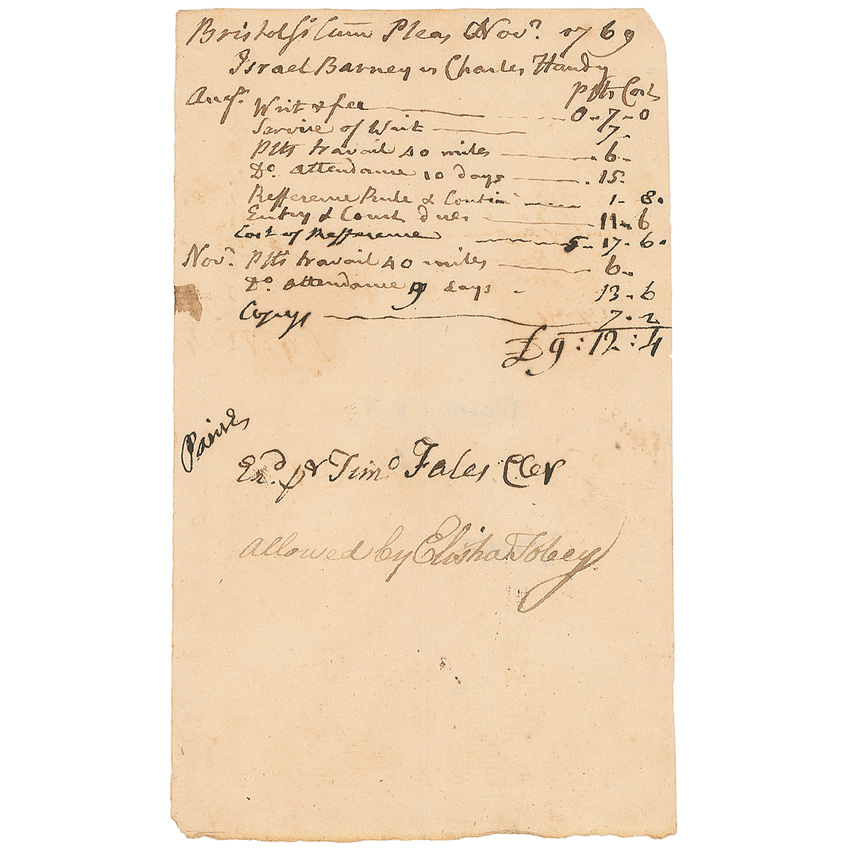 Massachusetts lawyer (1731–1814) who served as one of the prosecutors of British soldiers during the Boston Massacre trial; he later signed the Declaration of Independence. Manuscript DS, signed “Paine,” one page, 3.75 x 6.25, November 1769. Financial document pertaining to the case of “Israel Barney vs Charles Handy,” signed at the conclusion by Paine. Central horizontal and vertical fold and some scattered light toning, otherwise fine condition. Pre-certified John Reznikoff/PSA/DNA and RR Auction COA.