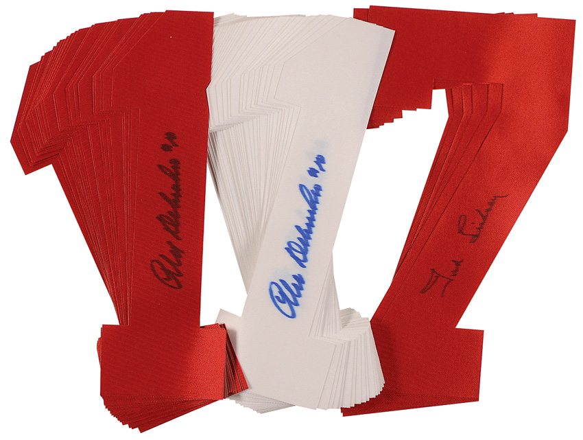 Sixty-five uniform numbers: 59 ‘1s,’ 34 white and 25 red, each signed in blue felt tip by Alex Delvecchio; and six ‘7s,’ each signed in felt tip by Ted Lindsay. In fine condition, with expected light feathering to signatures. RRAuction COA.