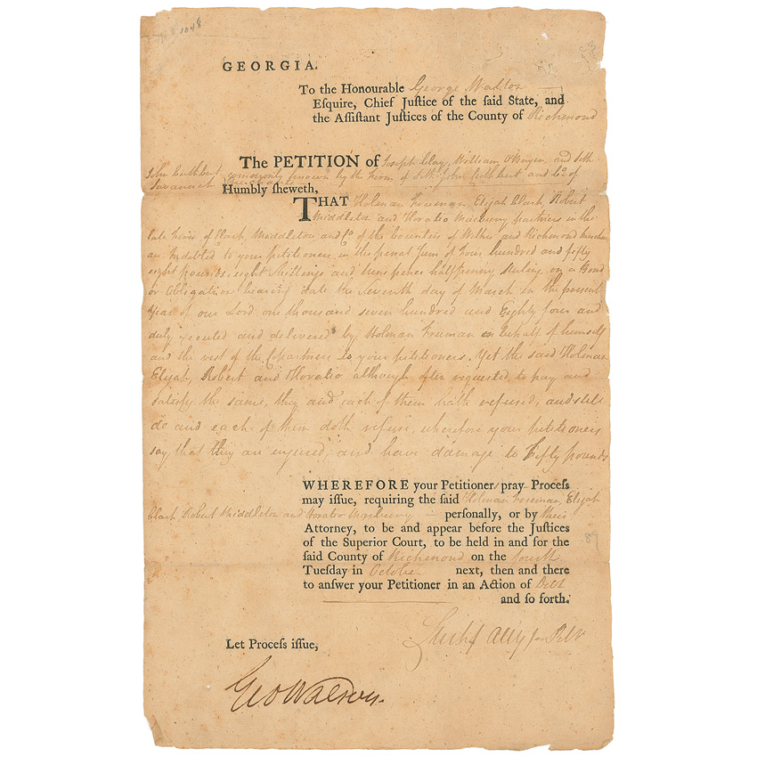 Signer of the Declaration of Independence from Georgia (1741–1804) who later served as that state’s chief justice, governor, and senator. Partly-printed DS, signed “Geo Walton,” one page, 7.75 x 12.25, no date. Walton, as chief justice of Georgia, approves a petition from Seth John Cuthbert and Company of Savannah concerning a debt, boldly signed at the conclusion by Walton. Several horizontal folds, with a couple of repairs along folds on reverse, a repaired tear to top edge, a few edge chips, scattered toning and foxing, and a few small pencil notations, otherwise very good condition. Pre-certified John Reznikoff/PSA/DNA and RR Auction COA.