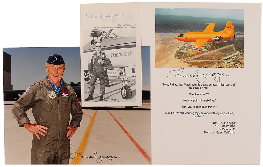 Three items: TQS signed in ink, “Chuck Yeager,” bearing a photo of the Glamorous Glennis affixed to an 8.25 x 10.75 trimmed white sheet with the quote from Yeager after breaking the sound barrier; a 4 x 7 clipped magazine photo of Yeager posing in front of the Tigershark, signed in blue ballpoint; and a color glossy 10 x 8 photo signed in black felt tip. In fine condition. RRAuction COA.