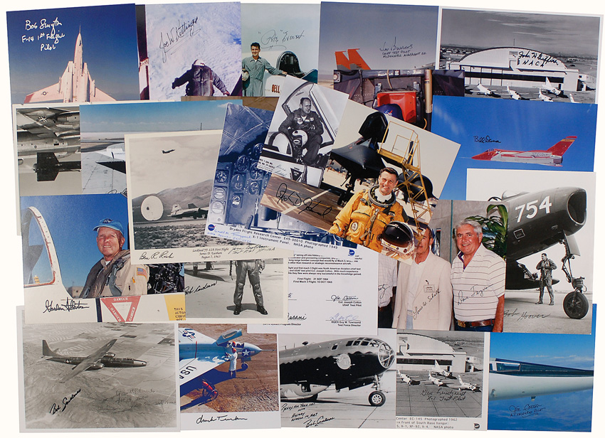 Twenty-four signed photos, almost all 8 x 10 or 10 x 8, various finishes, each signed in ink or felt tip by the respective test pilot or technician pictured. Signers include: Bill Dana, Robert Cardenas, Pete Everest, Gordon Fullerton, Paul MacCready, Bob Smyth, Ben R. Rich and Jim Eastham, Bob Hoover, Gerald Truszynski, Rogers Smith, Al White, Gus Lundquist, Joe Kittinger, John Griffith, Joe Cotton, and Jack Allavie. In overall fine condition, with one photo bearing a printed Glen Edwards signature. RRAuction COA.
