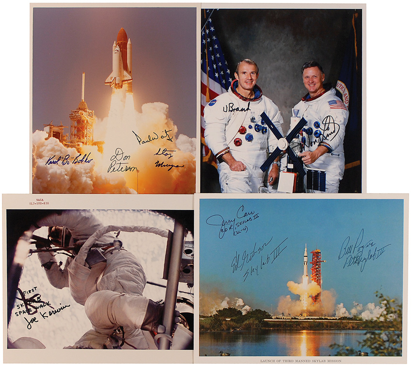 Four signed photos: color 10 x 8 NASA photo of the launch of the third Skylab mission, signed in black felt tip and ink by crew members Ed Gibson, Jerry Carr, and Bill Pogue; color satin-finish 8 x 10 photo of Vance Brand and Don Lind in their spacesuits, signed in black felt tip by both; color satin-finish 8 x 10 photo of a space shuttle lifting off, signed in black felt tip by Paul Weitz, Story Musgrave, Don Peterson, and Karol ‘Bo’ Bobko; and a color satin-finish 10 x 8 ‘red-numbered’ NASA photo of Joe Kerwin performing the first Skylab space walk, signed in black felt tip. In fine condition. Pre-certified Steve Zarelli and RR Auction COA.