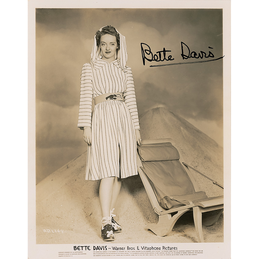 Glossy 8 x 10 Warner Bros. publicity photo of Davis posing at the beach, signed in black felt tip. In fine condition, with scattered surface marks and impressions. Pre-certified PSA/DNA and RR Auction COA.