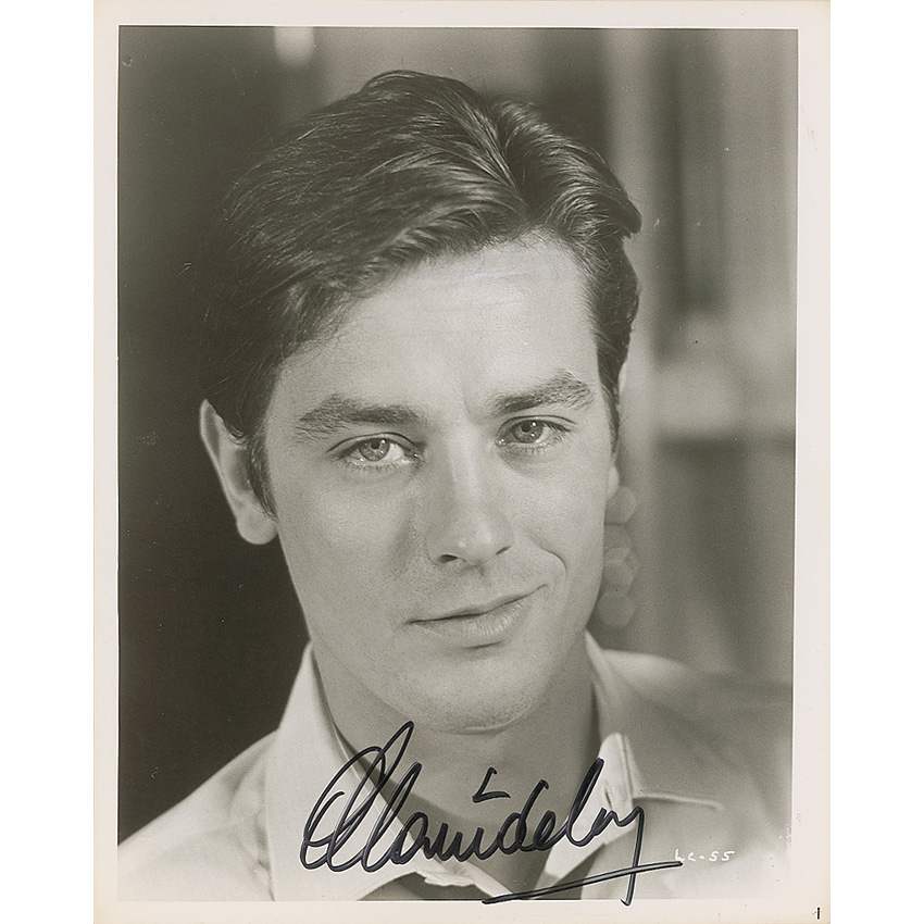 Glossy 8 x 10 publicity photo for “The Love Cage,” signed in black felt tip. Printed caption on reverse includes a synopsis of the film and a brief description of Delon’s character: “Marc, the cardsharp who turns chauffeur in order to elude pursuing gangsters.” In fine condition, with slight show-through from caption. Pre-certified PSA/DNA and RR Auction COA.