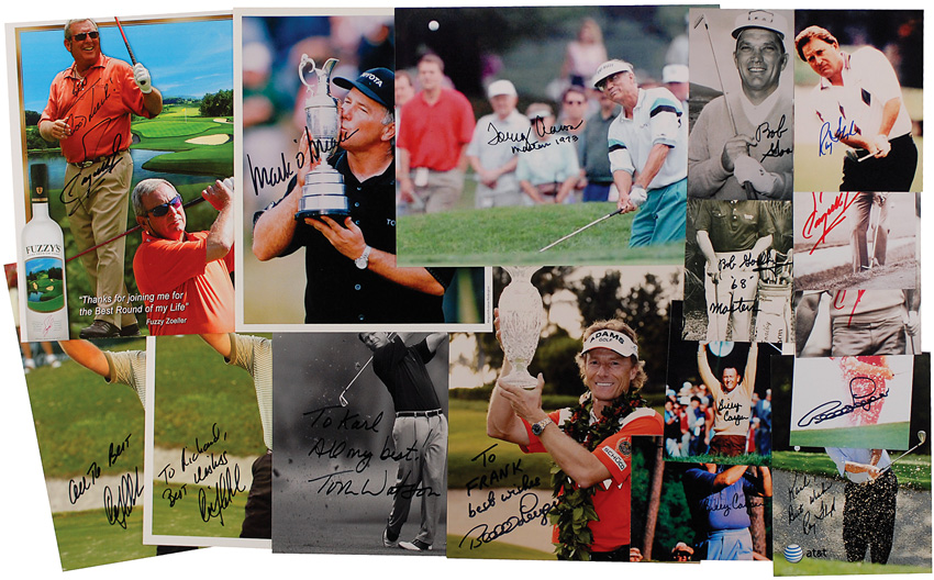 Sixteen signed photos, various finishes, ranging in size from 3.5 x 5 up to 8 x 10, each signed in felt tip by the respective former Masters champion pictured, with some adding brief inscriptions. Signers are: Billy Casper (2), Bob Goalby (2), Ray Floyd (2), Fuzzy Zoeller (3), Bernhard Langer (2), Tommy Aaron, Mark O’Meara, Craig Stadler (2), and Tom Watson. In fine condition. RRAuction COA.