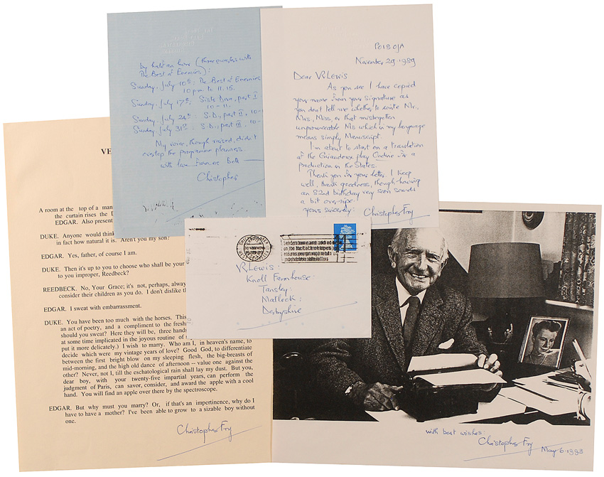British playwright (1907-2005) remembered for his 1948 romantic comedy The Lady's Not for Burning. Four items: two ALSs (one with original mailing envelope), one signed “Christopher,” the other signed in full, talking about working on Sister Dora and a translation of Giraudoux’s Ondine; one souvenir script page from Venus Observed; and a photocopied photo, each signed in blue ballpoint. In fine condition. RRAuction COA.