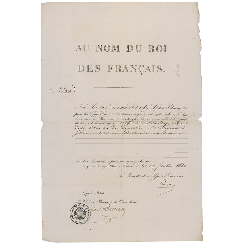 French statesman (1787-1874) who served as the 22nd Prime Minister of France under King Louis Philippe I, forced to resign during the Revolution of 1848. He is remembered as the originator of the often-reworked quote, ‘Not to be a republican at 20 is proof of want of heart; to be one at 30 is proof of want of head.’ Partly-printed DS, in French, signed “Guizot,” one page, 10 x 15.25, July 19, 1841. Untranslated official appointment also signed by the Chief of the Chancellery. In very good condition, with a few separations along the intersecting folds of the lightweight paper, some tears to the edges, scattered creasing, and a light pencil notation away from the signature. RRAuction COA.