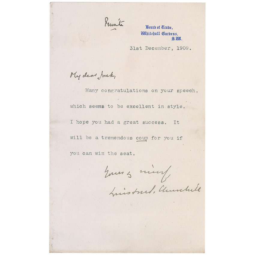 TLS signed “Winston S. Churchill,” one page, 5 x 8, Board of Trade letterhead, December 31, 1909. Letter, marked at the top by Churchill “Private,” and addressed in his hand to his brother, “My dear Jack.” In full: “Many congratulations on your speech, which seems to be excellent in style. I hope you had a great success. It will be a tremendous coup for you if you can win the seat.” Churchill also adds, “Yours sincerely,” before his signature. In very good condition, with scattered creasing and wrinkling from mounting remnants on reverse, a bit of light toning and soiling, and a couple surface impressions.
