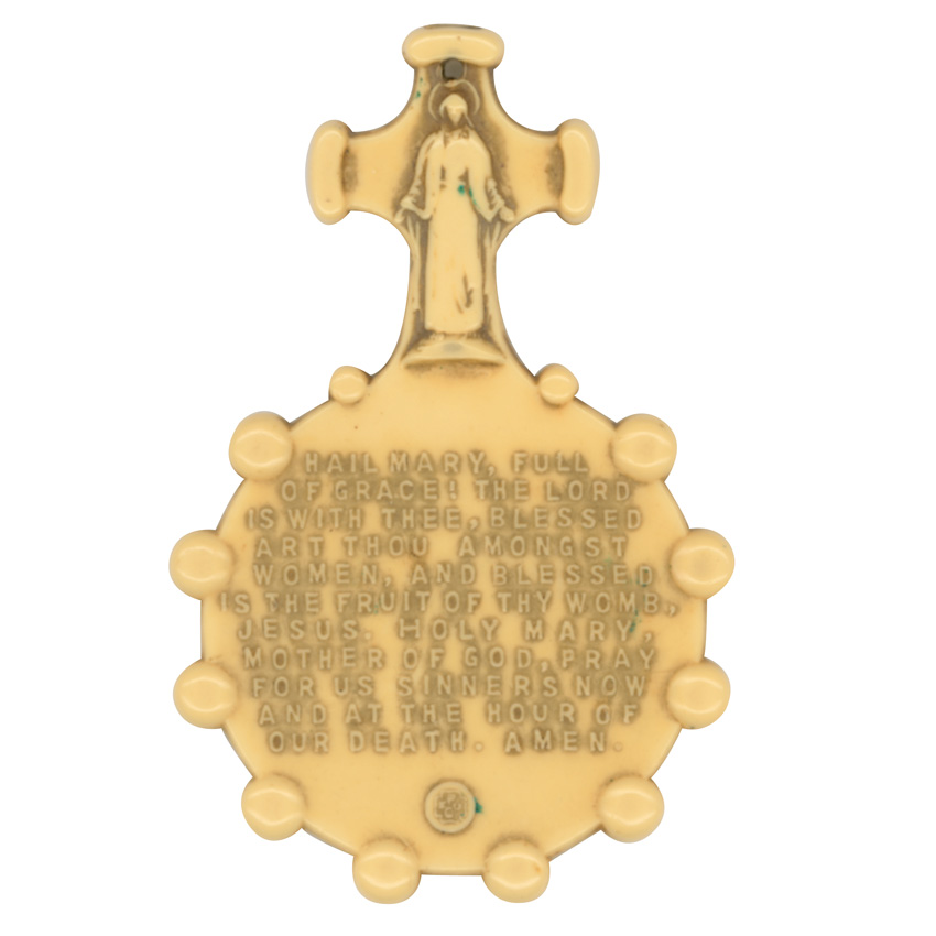 Al Capone’s personally-owned and used rosary center. This white plastic rosary center measures approximately 1.5″ x 2.25″, with the Our Father in raised letters on one side and the Hail Mary on the reverse. Capone carried this rosary with him while in prison from 1932–1939, including almost five years at Alcatraz. Provenance: Butterfields 2000.
