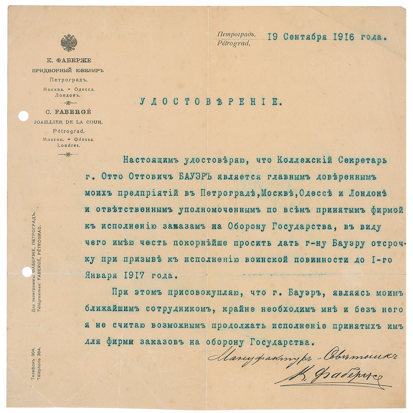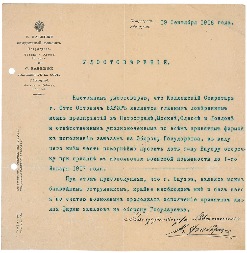 Russian jeweller (1846–1920) best known for the famous Faberge eggs made of precious metals and gems. Scarce TLS in Russian, signed in Cyrillic, “K. Faberge,” one page, 8 x 8, Faberge letterhead, September 19, 1916. In full: “I hereby certify that Collegiate Secretary Mr. Otto Ottovich Bauer is the general proxy of my businesses in Petrograd, Moscow, Odessa, and London, and is the responsible representative for all the firm’s undertakings in filling orders for the Defense of the Nation, by virtue of which it is my honor to sincerely request that Mr. Bauer be granted a deferment from conscription for the performance of military duties until January 1, 1917. In this regard, I would add that Mr. Bauer is my aide-de-camp, that he is indispensable to me, and that I do not believe it would be possible for the firm to continue filling the orders it receives for the defense of the Nation without him.” In very good condition, with horizontal and vertical folds, punch holes to left edge, scattered creases, and a uniform shade of toning.