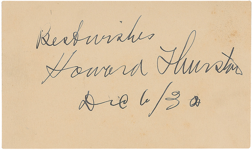 Vintage fountain pen signature, “Best wishes, Howard Thurston, Dec 6/30,” on an off-white 5 x 3 card. Mild uniform toning and scattered soiling, otherwise fine condition. Pre-certified PSA/DNA and RR Auction COA.