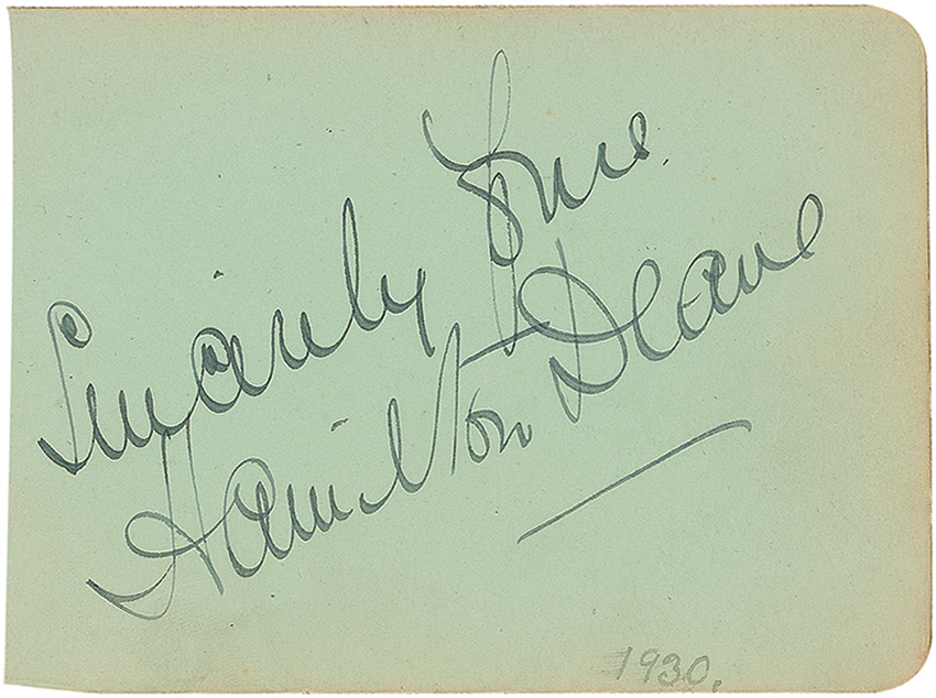 Playwright (1880–1958) who adapted Dracula as a stage play from Bram Stoker’s novel of the same name. Deane’s 1924 adaptation was the first authorized by Stoker's widow, and has influenced many subsequent adaptations. Vintage fountain pen signature, “Sincerely yours, Hamilton Deane,” on a light green 4.25 x 3.25 album page. In fine condition, with toning to the edges. RRAuction COA.