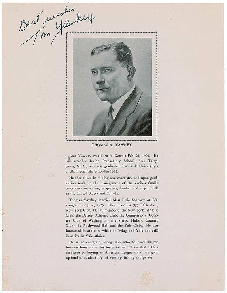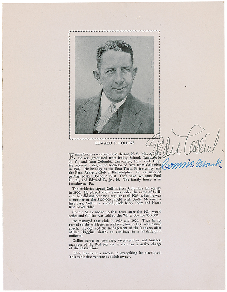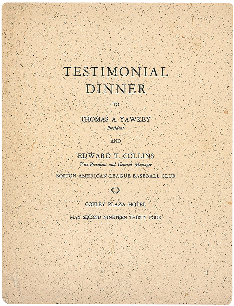 Program from a testimonial dinner to Thomas Yawkey and Eddie Collins, held at the Copley Plaza Hotel in Boston on May 2, 1934, 8.5 x 11.25. Signed inside in fountain pen by Connie Mack and Tom Yawkey, and signed in pencil by Eddie Collins. Some scattered light creasing and soiling, and expected handling wear, otherwise fine condition.