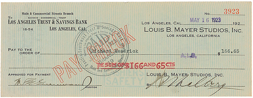 Louis B. Mayer Studios, Inc. business check, 8.5 x 3.25, filled out in type and signed by Thalberg, “I. Thalberg,” payable to Richard Headrick for $166.65, stamp-dated May 16, 1923. Expected vertical folds, scattered light creasing, mild toning to edges, and some brushing to the signature, otherwise fine condition. Pre-certified PSA/DNA and RR Auction COA.