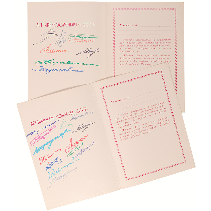 Two unissued awards citations, each 8 x 11.25, two pages. These citations were prepared to be awarded in commemoration of the 20th anniversary of the space era. One is signed inside in felt tip by nine cosmonauts: Valeri Bykovski, Valeri Rozhdestvenski, Yuri Glazkov, Lev Dyomin, and Georgi Beregovoy; the second is signed inside in felt tip by 13 cosmonauts: Gherman Titov, Georgi Beregovoy, Vladimir Shatalov, Viktor Gorbatko, Yevgeny Khrunov, Boris Volynov, Yuri Artyukhin, Lev Dyomin, Vyacheslav Zudov, Yuri Glazkov, Vladimir Kovalyonok, Vasyli Lazarev, and Pavel Popovich. In fine condition. Pre-certified Steve Zarelli and RR Auction COA.
