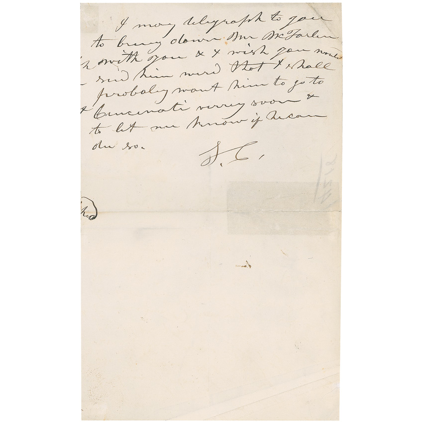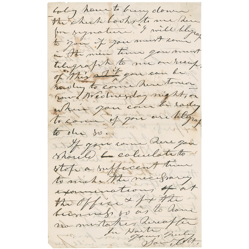 Inventor of the Colt revolver and founder of the Colt Firearms Company (1814–1862). ALS signed “Saml. Colt,” three pages on two adjoining sheets, 5 x 8, April 9, 1861. Colt hastily dictates orders to his secretary. In part: “I have your note of yesterday with enclosures form Col Cooper. Should you receive the package of letters & Papers returned to me From New Orleans I want you to send them to me at 240 Broadway by the first express & mail the Express receipt for them to me at the St. Nicholas Hotel. I may leave here for the South before returning to Hartford hence it will be necessary for you to have your payroll & other accounts…with the usual checks drawn for my signature. You will probably have to bring down the check books to me here for signature. I will telegraph to you if you must come in the mean time you must telegraph to me on receipt of this if you can be ready to come here tomorrow, Wednesday night, or when you can be ready to come if you are telegraphed to do so. If you come here you should calculate to stop a sufficient time to make the necessary examinations at the office & fix the business so as to have no mistakes thereafter.” On the second page, Colt adds a postscript, signed “S. C.” Colt writes: “I may telegraph to you to bring down Mr. McFarlen with you & I wish you now send him word that I shall probably want him to go to Cincinnati very soon & to let me know if he can do so.” In very good condition, with partial separations along central horizontal fold and hinge, scattered toning and show-through from text on opposite sides, a couple of archival reinforcements to folds and small tears, and a couple of light creases. At the beginning of the war Colt would sell arms to both the North and South, eventually being labeled a Southern sympathizer. Pre-certified John Reznikoff/PSA/DNA and RR Auction COA.