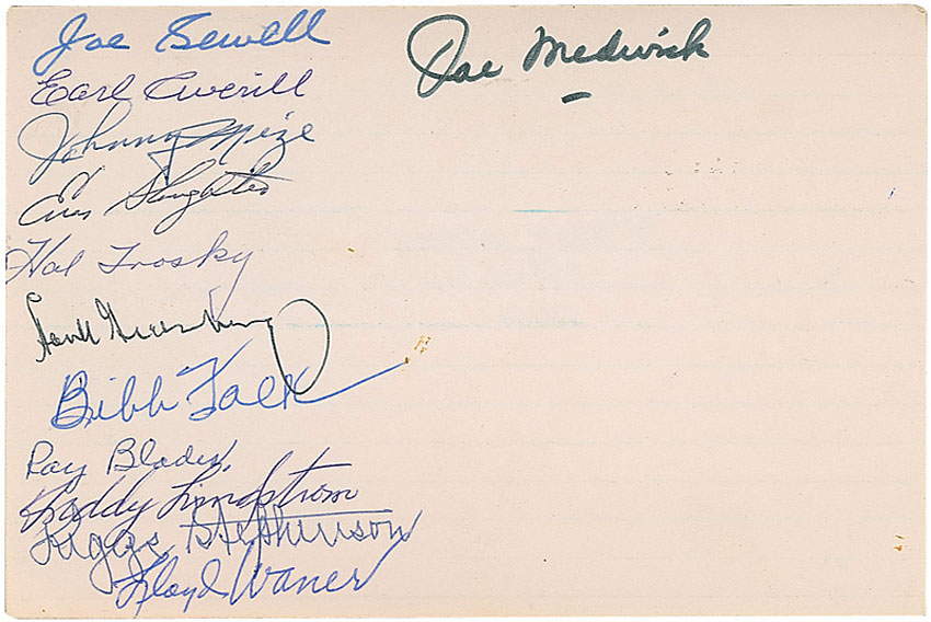 Ink and felt tip signatures of 12 former players on an off-white 6 x 4 card. Signers include: Joe Sewell, Earl Averill, Johnny Mize, Enos Slaughter, Hank Greenberg, Freddy Lindstrom, Lloyd Waner, and Joe Medwick. In fine condition, with some scattered light soiling and a few signatures slightly overlapping. Pre-certified Steve Grad/PSA/DNA and RR Auction COA.