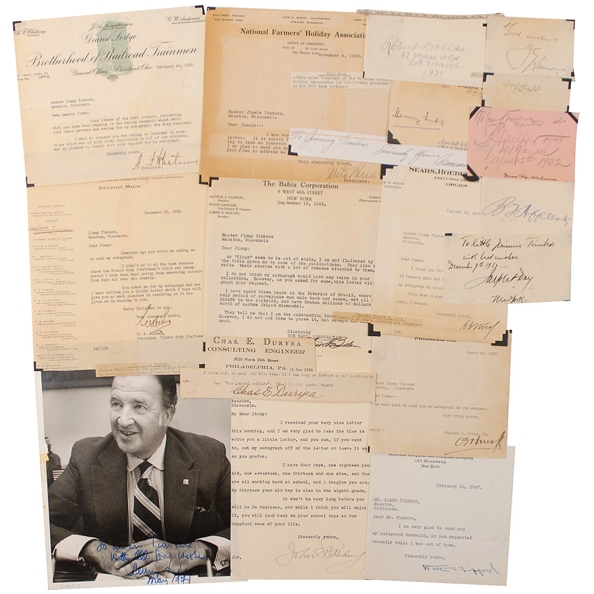 Eighteen items consisting of signatures and TLSs, on various size slips, cards, and sheets, each signed by a renowned businessman. Signers are: John Pillsbury, Charles Hires, Henry Ford II (2), Norman DeVaux, Charles Duryea, Zack T. Miller, Zalmon Simmons, Jakob Raskob, Robert Dollar, W. A. Fisher, Walter Gifford, Benjamin Affleck, Milo Reno, Joseph P. Day, Alexander Whitney, Arthur B. Adler, and Robert Wood. In very good condition, with various scattered toning, folds and trimmed edges to letters, and mounting remnants to many of the corners. RRAuction COA.