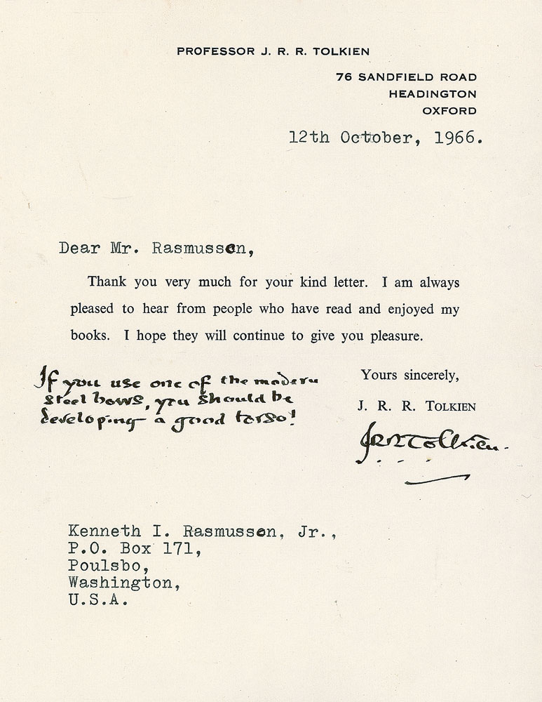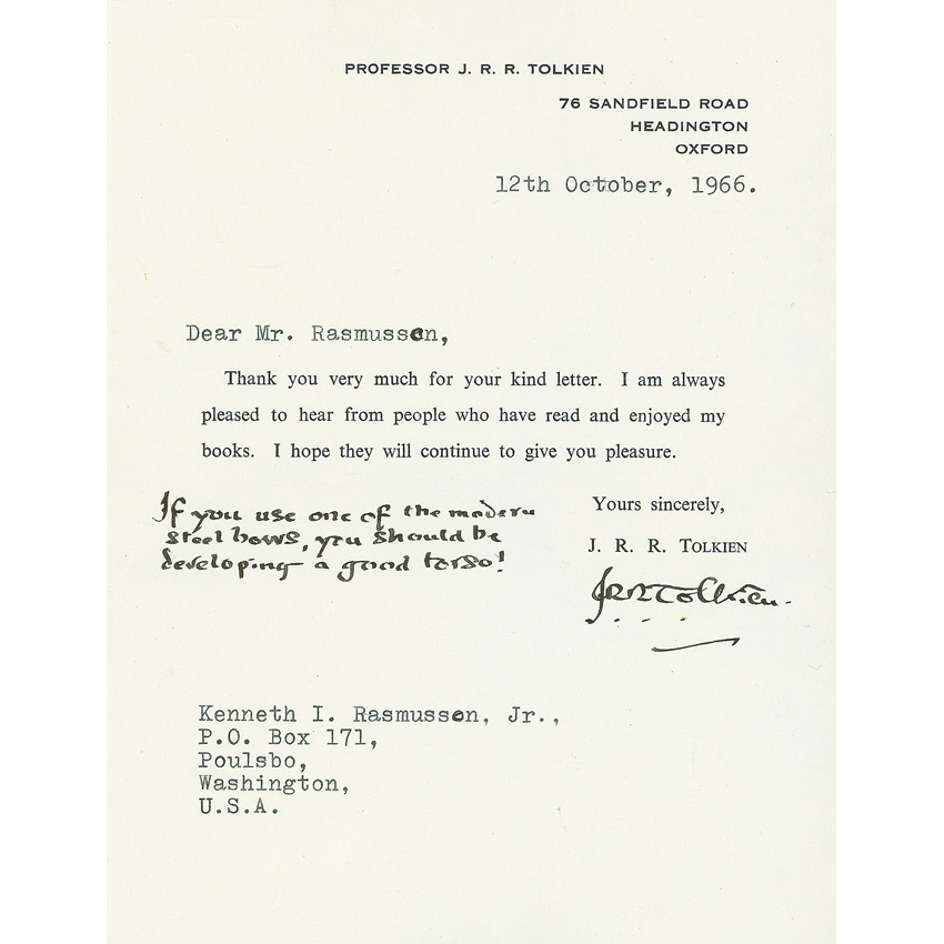 British author and scholar (1892–1973) whose Lord of the Rings trilogy became one of the towering classics of fantasy literature and inspired a series of wildly popular films. TLS, one page, 5.25 x 7, personal letterhead, October 12, 1966. Too overwhelmed to send personal responses following the resurgence in popularity of The Lord of the Rings, especially in America, in the 1960s, Tolkien sent this preprinted letter with typed-in name and address, signing in ink in his distinctive calligraphic hand. In full: “Thank you very much for your kind letter. I am always pleased to hear from people who have read and enjoyed my books. I hope they will continue to give you pleasure.” After signing, Tolkien adds a handwritten postscript: “If you use one of the modern steel bows, you should be developing a good torso!” Accompanied by the original mailing envelope. In fine, clean condition.