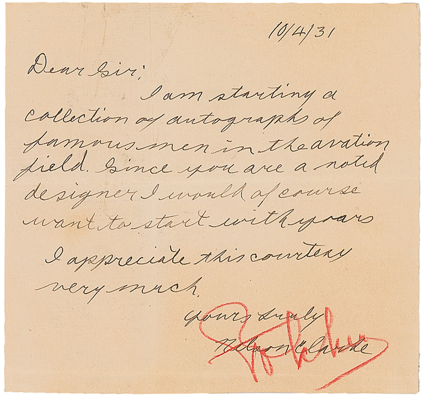 Vintage red pencil signature, “Fokker,” on an off-white 5.25 x 5 sheet, 10/4/1931, a note from an admirer requesting his autograph. Intersecting folds, a paperclip impression to the upper left, and Fokker’s signature over that of the requester (he commonly signed this way), otherwise fine condition. RRAuction COA.