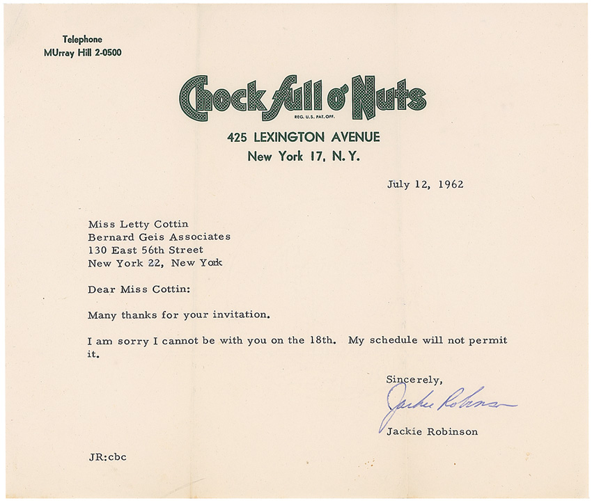 TLS, one page, 8.5 x 7.25, Chock Full o’ Nuts letterhead, July 12, 1962. Robinson’s RSVP to writer Letty Cottin. In full: “Many thanks for your invitation. I am sorry I cannot be with you on the 18th. My schedule will not permit it.” In fine condition, with intersecting folds, one through a single letter of the signature, and trivial creasing to corner tips. Pre-certified Steve Grad/PSA/DNA and RR Auction COA.
