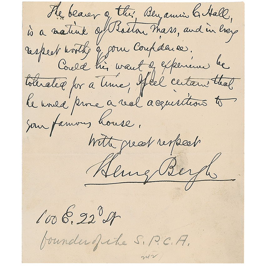 Activist (1813–1888) who founded the ASPCA in 1866. ALS, one page, 5 x 5.75, no date. A brief letter of recommendation. In full: “The bearer of this, Benjamin C. Hall, is a native of Boston, Mass, and in every respect worthy of your confidence. Could his want of experience be tolerated for a time, I feel certain that he would prove a real acquisition to your famous house.” Intersecting folds, trimmed top edge, thumb print to part of the signature, and a pencil notation to the bottom, otherwise fine condition. RRAuction COA.