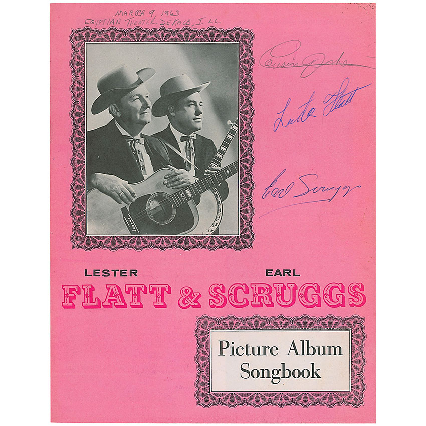 Lester Flatt and Earl Scruggs Picture Album Songbook, 8.25 x 10.75, 12 pages, with lyrics and photos of the bluegrass duo inside, signed on the front cover in blue ballpoint “Lester Flatt” and “Earl Scruggs,” and pencil, “Cousin Jake” [bassist English P. Tullock]. A pencil collector’s notation to the upper left indicates that it was signed on March 9, 1963, at the Egyptian Theater in DeKalb, Illinois. In fine condition, with trivial soiling and a few pencil notations inside. RRAuction COA.