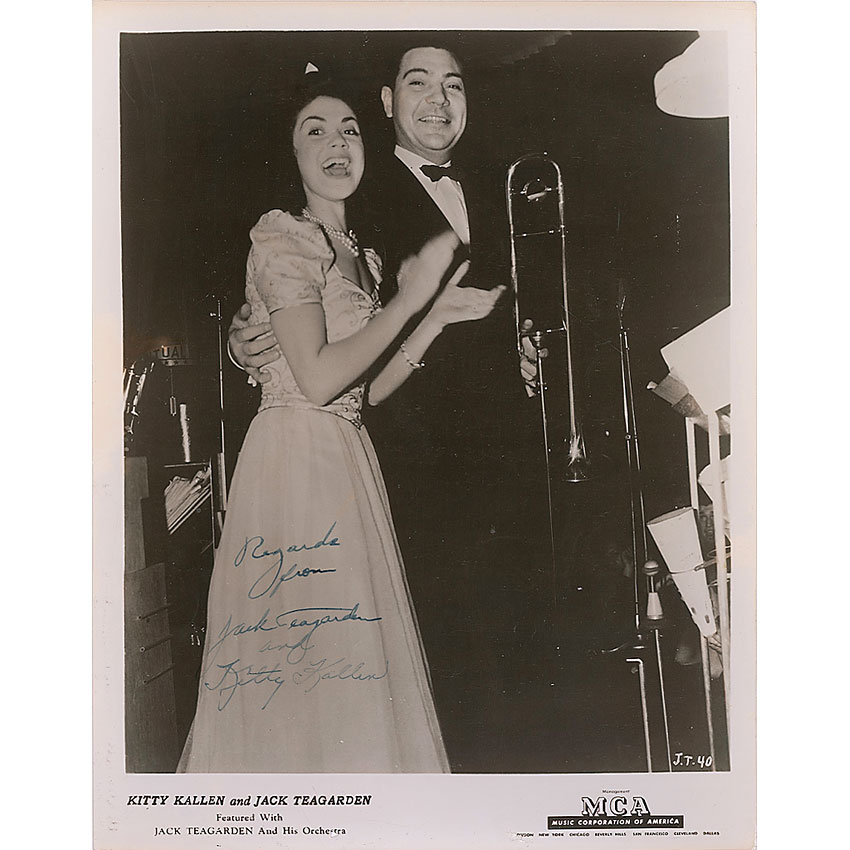 Vintage glossy 8 x 10 MCA publicity photo of Kallen and Teagarden, signed in fountain pen, “Regards from Jack Teagarden,” “and Kitty Kallen.” Scattered creases and two tack holes to the bottom, otherwise fine condition. RRAuction COA.