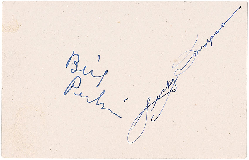 Ink signatures, “Bill Perkins” and “Lucky Thompson,” on an off-white 4.25 x 2.75 card. In fine condition, with a couple trivial spots of soiling. RRAuction COA.