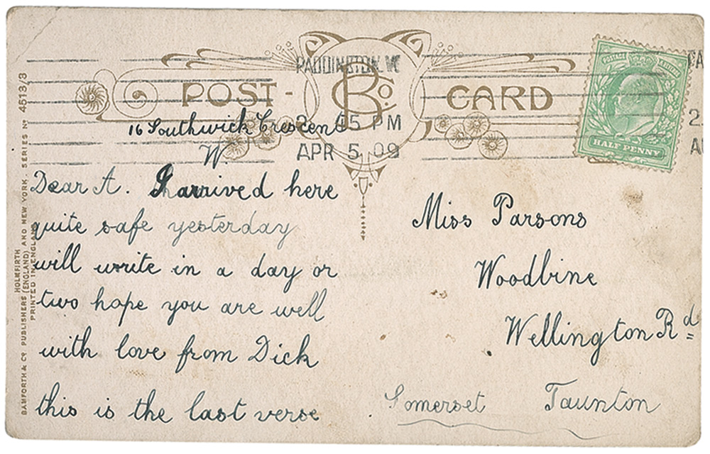 Second class steward aboard the Titanic, with a monthly salary of £3 15s. Parsons died in the sinking. His body, if recovered, was never positively identified. Three postcards related to Richard Parsons, two 5.25 x 3.25 and one 3.25 x 5.25. One is written and signed by Parsons, to his sister, postmarked April 5, 1909, and reads, “I arrived here quite safe yesterday. Will write in a day or two. Hope you are well, with love from Dick.” Other postcards are sent to Parsons from his mother and sister. Postcard sent to Richard by his mother (August 1909) is worded in part: “My dear Dick, just a card to wish you many happy...of your Birthday, sorry I have nothing to send you...with love from mother." Postcard sent to Richard by his sister Addie (September 30, 1909) is worded in parts: “Dear D...you are collecting P.C, I have sent you one it is the new fountain. Ruth is still staying here. I hope you are quite well. We have been expecting to hear from you. I had a letter from Cecil last night he said he had been to see you. Please write soon, with love from us both. Addie " In overall very good condition.
