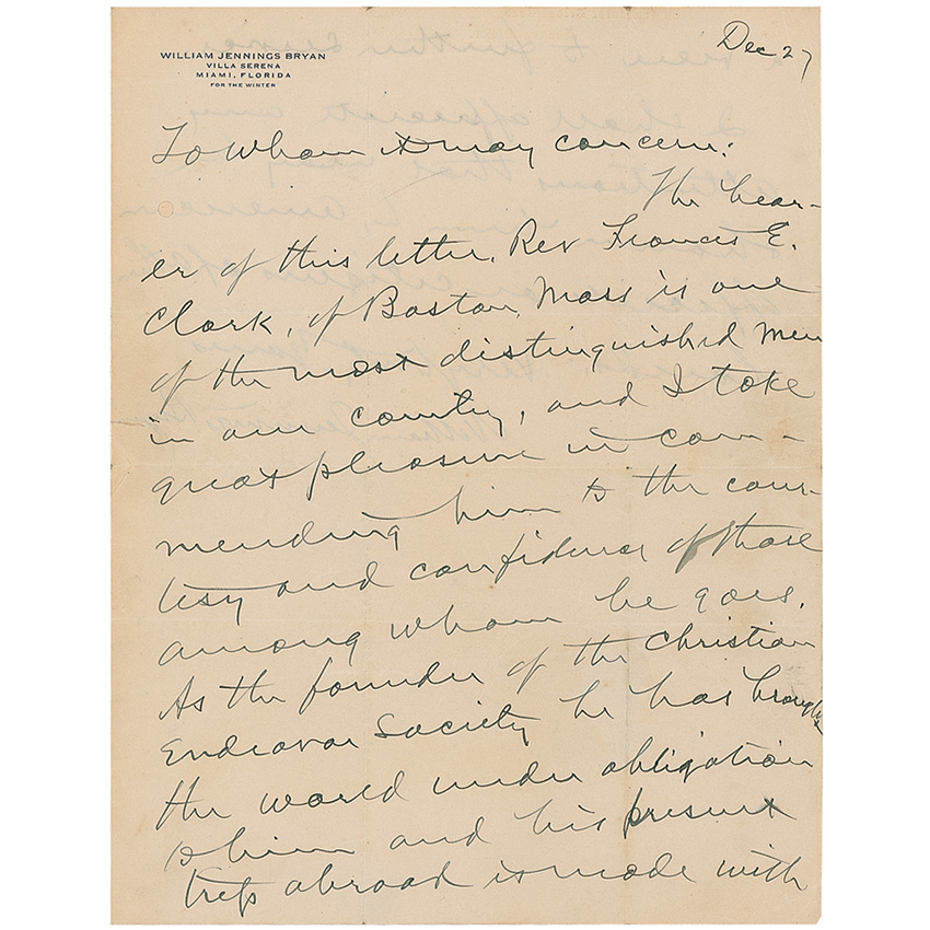 ALS, one page both sides, 8.25 x 11, personal letterhead, December 27. Letter of introduction for Reverend Francis Clark. In part: “The bearer of this letter, Rev. Francis E. Clark, of Boston, Mass, is one of the most distinguished men in this country, and I take great pleasure in commending him to the courtesy and confidence of those among whom he goes. As the founder of the Christian Endeavor Society he has brought the world under obligation to him and his present trip abroad is made with a view to further service.” Letter is affixed by the lower portion of the reverse to a 9.5 x 13.5 off-white sheet. In very good condition, with intersecting folds, a few creases, and scattered light toning and soiling. RRAuction COA.