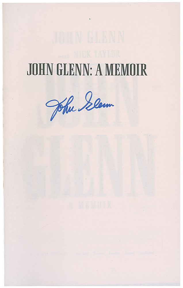 Signed book: John Glenn: A Memoir. First edition, first printing. NY: Bantam, 1999. Hardcover with dust jacket, 6.5 x 9.5, 422 pages. Signed on the half-title page in blue felt tip. In fine condition. Pre-certified Steve Zarelli and RR Auction COA.