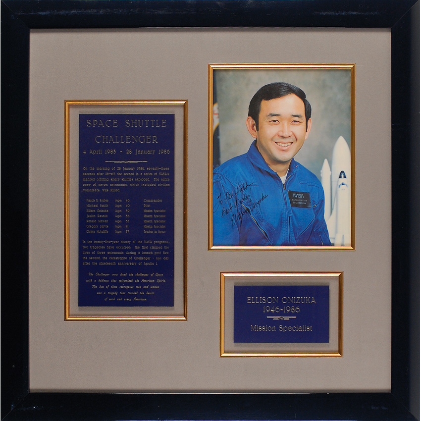 Color 7.25 x 9.25 NASA photo, signed and inscribed in black felt tip “To Pat Hart—Best wishes! Ellison Onizuka.” Impressively matted and framed with two plaques, a nameplate, and a commemoration of the Challenger mission to an overall size of 22 x 22. In fine condition. Oversized. Pre-certified Steve Zarelli and RR Auction COA.