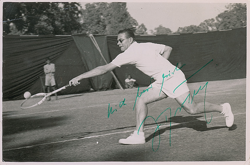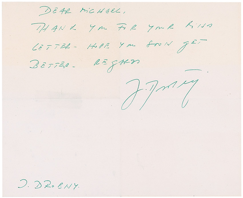 Multi-sport athlete (1921–2001) who was a 1948 Olympic hockey medalist as well as a 1954 Wimbledon champion. Two items: one glossy 6.25 x 4.25 photo of Drobny during a tennis match, signed in green ink “With best wishes, J. Drobny”; and an ALS signed “J. Drobny,” one page, 8 x 6.5, no date, expressing hope that a fan gets well soon. In fine condition, with scattered creases, impressions and irregularly trimmed edges to the photo. RRAuction COA.