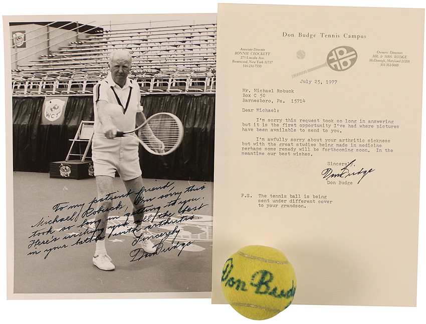 Three items: one Penn tennis ball signed in blue felt tip by Budge; one glossy 8 x 10 photo of Budge on the tennis court, signed with a lengthy inscription in black felt tip; and a TLS, one page, 7 x 10.5, Don Budge Tennis Campus letterhead, July 25, 1977, apologizing for the delay in sending his autograph. In fine condition, with a few marks and creases to the photo and general wear to the ball. RRAuction COA.