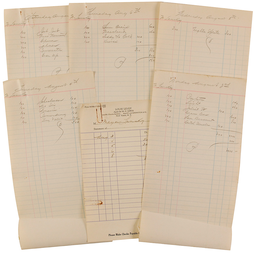 Five lined betting slips, filled out in an unknown hand in pencil, each measuring 5.5 x 14, and dated between August 3–August 8. Each of the five slips is labeled at the top, again in an unknown hand, “M. Lansky,” and has between one and six horses listed on them including Sea Biscuit, Teddy the Bold, Even Up, Dutch Uncle, and Schoolmom, with dollar amounts and most likely money won or lost in the adjacent columns. A sheet of Louis Levy lined stationery is also included, with Lansky’s name written at the top in an unknown hand, and his five day totals tallied in the adjacent columns. Rusty paperclip and mark to top edge and mild toning, otherwise fine condition.