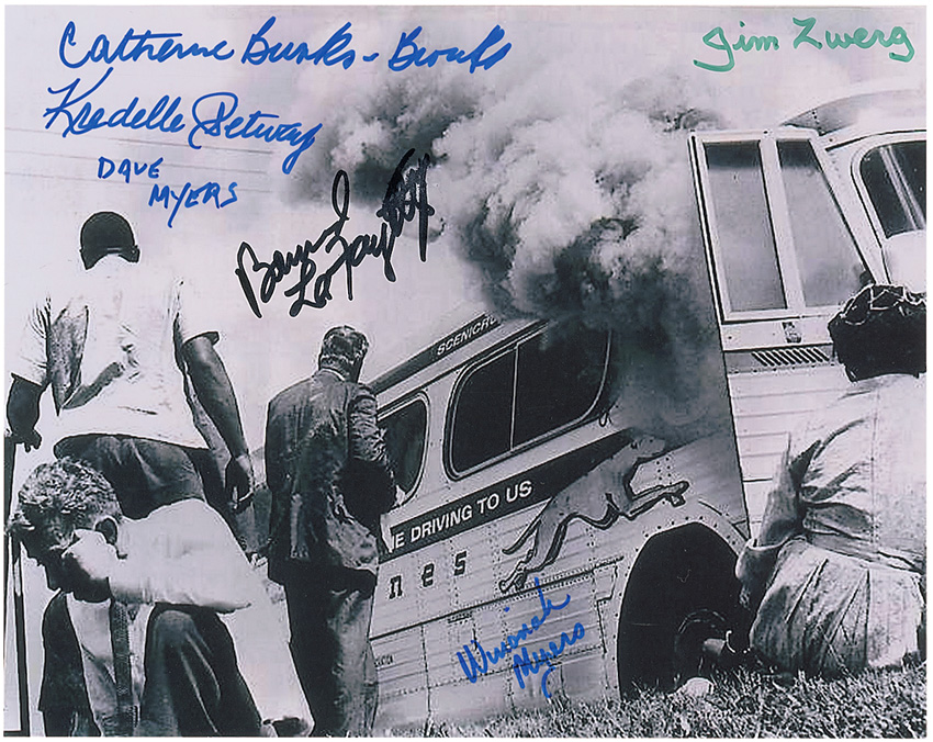 Satin-finish 10 x 8 photo of a burning Greyhound bus, signed in ink and felt tip by six original members of the Freedom Riders: Dave Myers, Kredelle Petway, Jim Zwerg, Catherine Burks, Winonah Myers, and Bernard La Fayette Jr. In fine condition, with image a bit grainy. RRAuction COA.