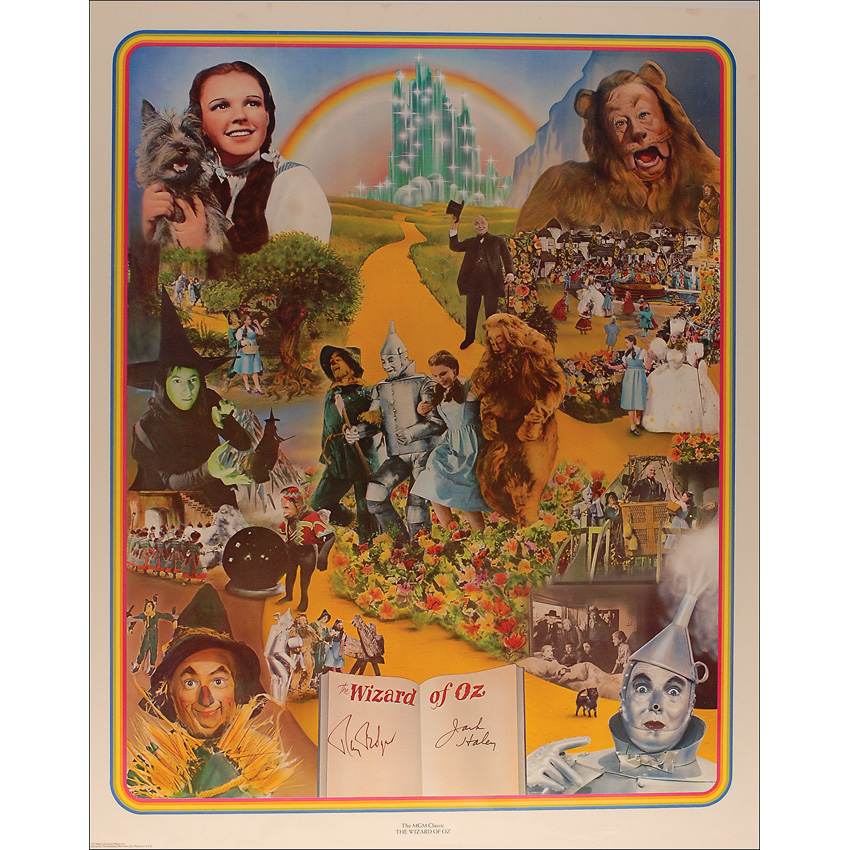 Color 24 x 30 composite print featuring numerous images from the film, signed at the bottom in brown felt tip by Ray Bolger and Jack Haley. Rolled with scattered creases, a couple small tears to the edges, and a few spots of soiling to the borders, otherwise fine condition. Pre-certified PSA/DNA and RR Auction COA.