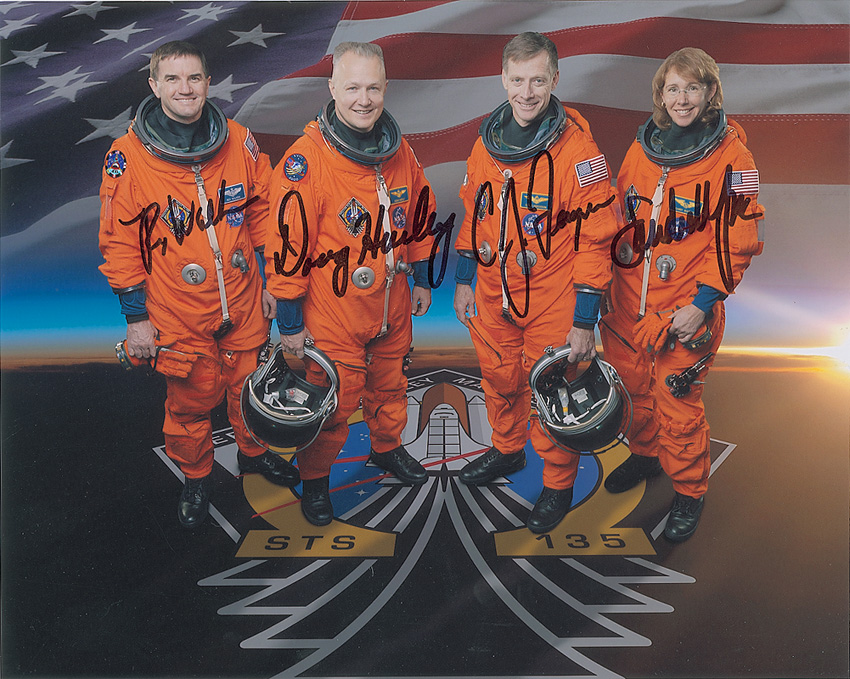 Color satin-finish 10 x 8 photo of the final Space Shuttle crew posing in their flight suits against a patriotic background, signed in black felt tip by Christopher Ferguson, Douglas Hurley, Rex Walheim, and Sandy Magnus. In very fine condition. Pre-certified Steve Zarelli and RR Auction COA.