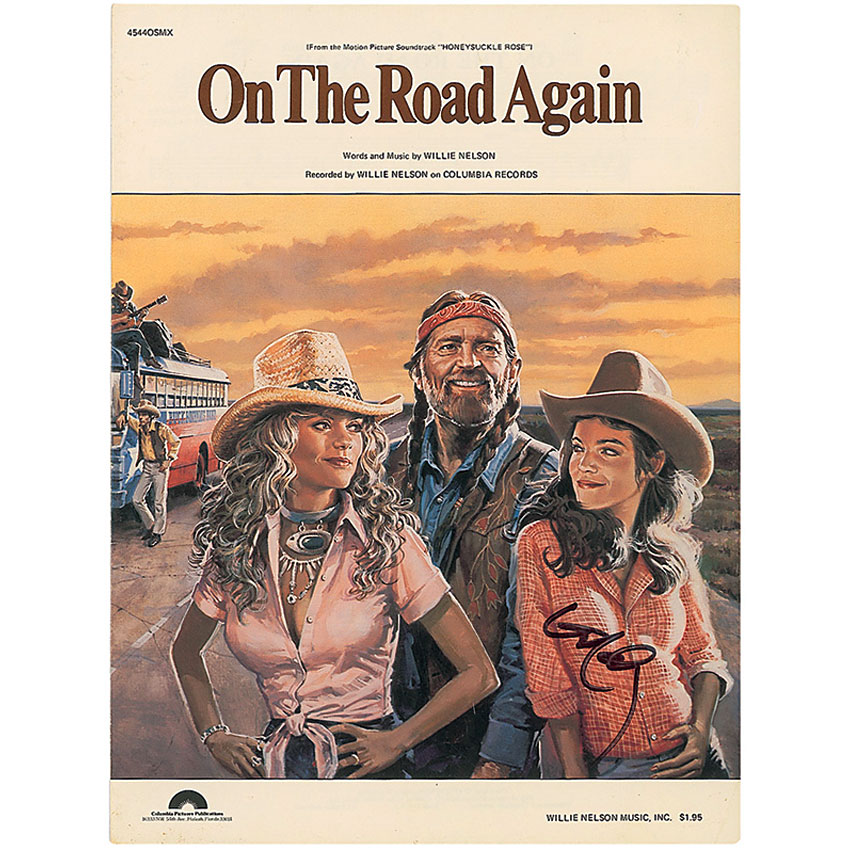 Sheet music to ‘On the Road Again,’ five pages, 9 x 12, signed on the cover in black felt tip. In fine condition, with a few creases and impressions, and ink notations to the music inside. RRAuction COA.
