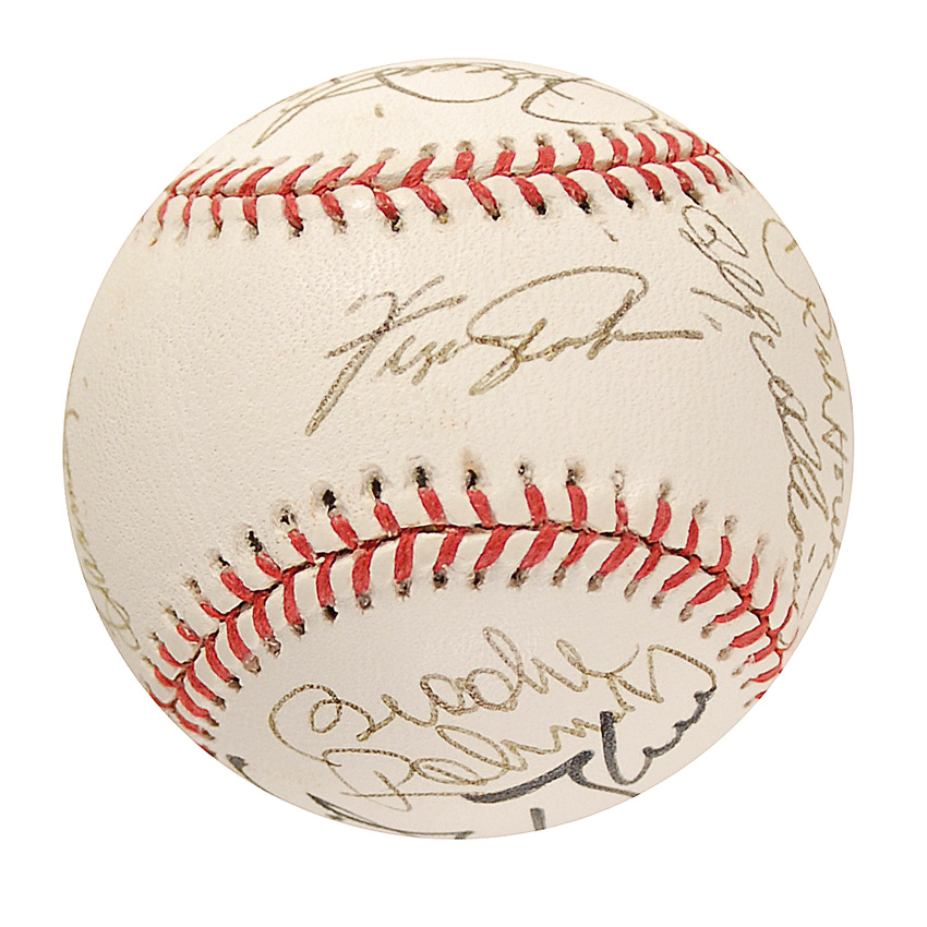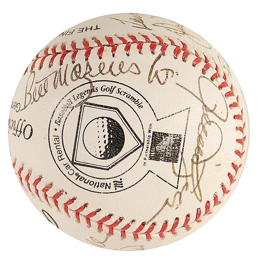 Rawlings Official League baseball with National Car Rental Baseball Legends Golf Scramble logo, signed in black ballpoint and felt tip by twelve baseball greats. Signers are: Harmon Killebrew, Brooks Robinson, Fergie Jenkins (ss), Bill Mazeroski, Rollie Fingers, Billy Williams, Dick Williams, Lew Burdette, Ralph Houk, Vida Blue, Sparky Lyle, and Boog Powell. In fine condition. Pre-certified Steve Grad/PSA/DNA and RR Auction COA.