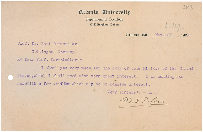 Influential black writer and educator (1868–1963) who helped transform the prevailing view of his people’s role in America. TLS, one page, 8.5 x 5.5, Atlanta University Department of Sociology letterhead, November 21, 1908. Letter to historian Prof. Paul Darmstadter of the University of Goettingen. In full: “I thank you very much for the copy of your History of the United States, which I shall read with very great interest. I am sending you herewith a few trifles which may be of passing interest.” In very good condition, with scattered creases and light foxing, a vertical fold passing through a single letter of the signature, light uniform toning, a punch hole to the left side, and pencil notations to the upper right. While at Atlanta University, DuBois published a groundbreaking academic paper, The Philadelphia Negro, the first scientific sociological study performed in the US. Pre-certified PSA/DNA and RR Auction COA.