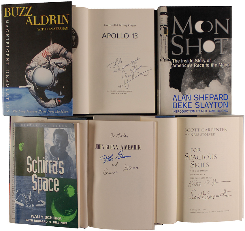 Four hardcover and one softcover books, each signed on an opening page by the respective astronaut, with four inscribing to astronaut secretary Lola Morrow. Signers are: John and Annie Glenn (John Glenn: A Memoir); James Lovell (Apollo 13); Wally Schirra (Schirra’s Space); Alan Shepard and Wally Schirra (Moonshot); and Scott Carpenter (For Spacious Skies). A couple of the book’s authors have also signed the books. In fine condition. Pre-certified Steve Zarelli and RR Auction COA.