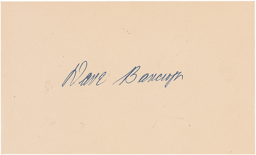 Ballpoint signature, “Dave Bancroft,” on an off-white 5 x 3 card. In fine condition. Pre-certified Steve Grad/PSA/DNA and RR Auction COA.