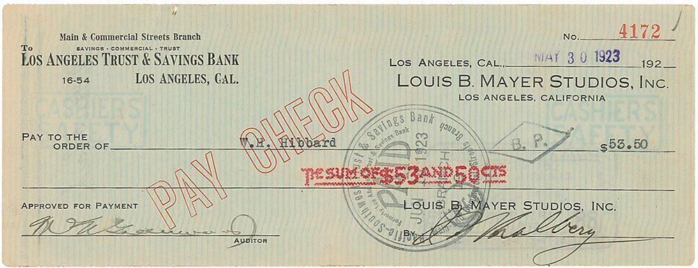 Louis B. Mayer Studios, Inc., business check, 8.25 x 3, filled out in type and signed by Thalberg, “I. Thalberg,” payable to W. H. Hibbard for $53.50, stamp-dated May 30, 1923. In very good condition, with several vertical folds, scattered toning, paperclip impression to top, and two bank stamps to body, one over beginning of signature. Pre-certified PSA/DNA and RR Auction COA.