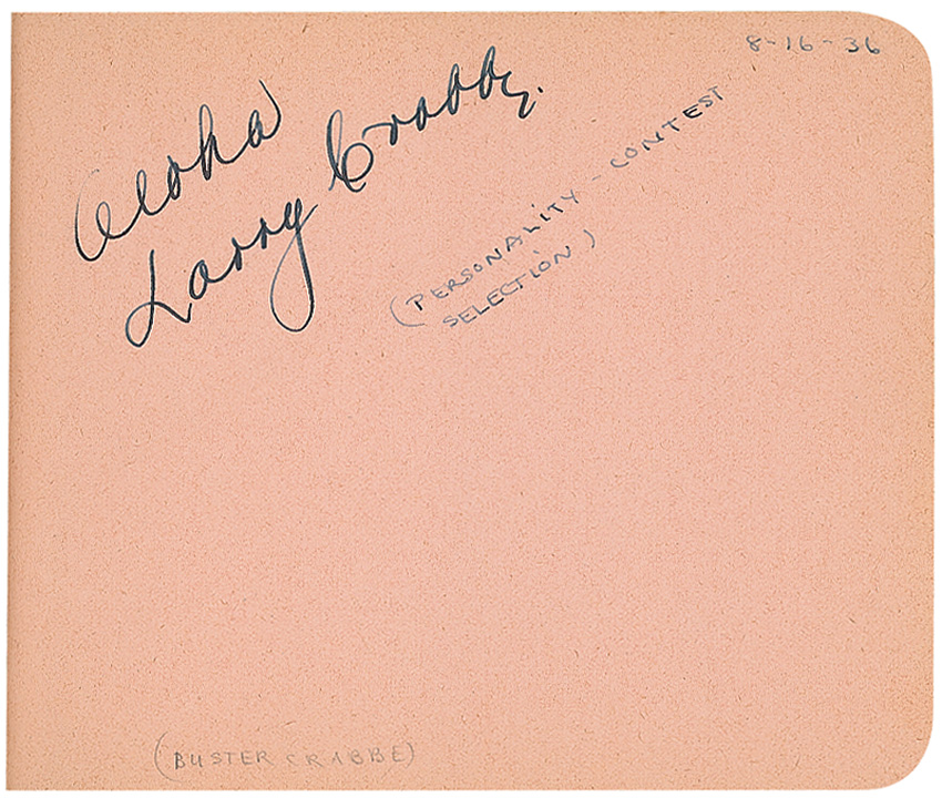 Vintage softcover autograph album, 6.25 x 4.5, signed inside in fountain pen and pencil by 38 celebrities and friends, with some adding brief inscriptions, and most signatures single page, with a few back-to-back. Signers include: Henry Armetta, Martha Raye, Buster Crabbe (signing “Larry Crabbe”), Noah Berry, Jr., Dixie Dunbar, Renee Torres, May Robson, Wendie Barrie, Jean Rogers, Ann Rutherford, Joe Ploski, Benny Baker, Cora Sue Collins, James Ralph Boyle, Lilia Kipi Koua, Jack Chapin, Baron F. Paul von Hager, Chester Morris, Gilda Gray, Robert Young, Warren Hull, Donald Woods, Gene Raymond, Anita Louise, Craig Reynolds, Fred Stone, Judith Arlen, Nat Pendleton, Jeanne Dante, Eugene Paulette, and Cannonball Jones. In fine condition, with some scattered light toning. Pre-certified PSA/DNA and RR Auction COA.