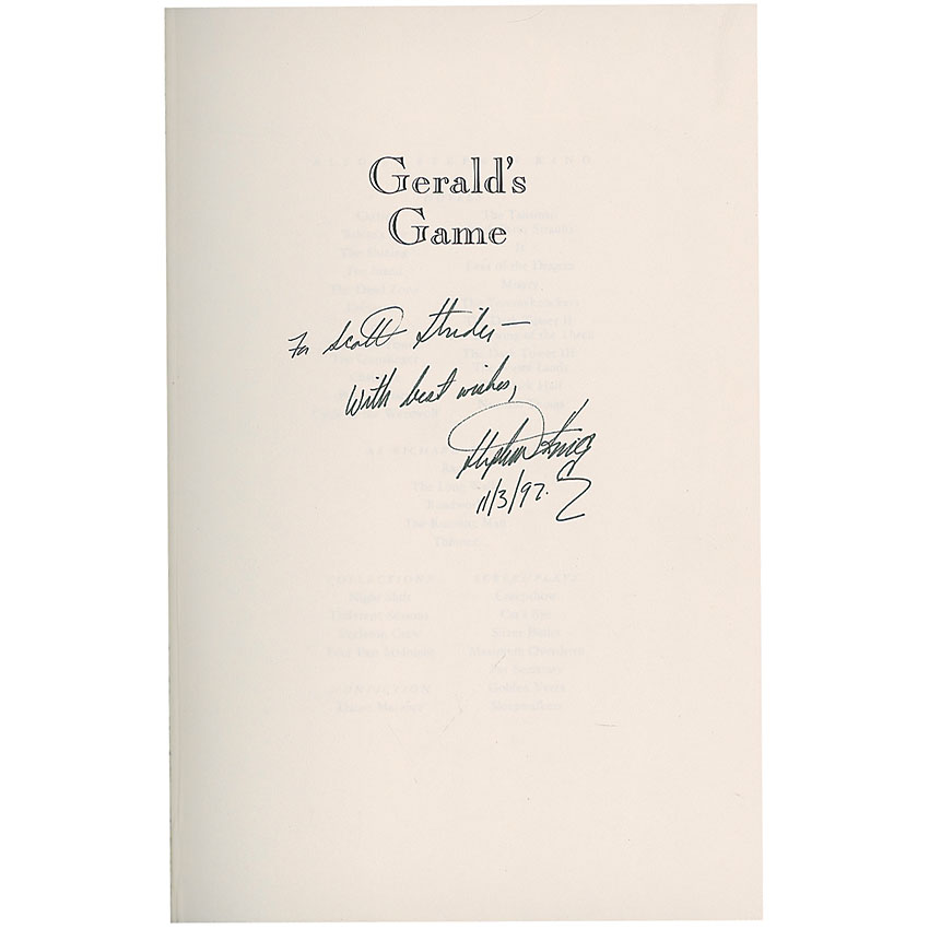 Signed book: Gerald’s Game. First edition, first printing. NY: Viking Press, 1992. Hardcover with dustjacket, 6.5 x 9.5, 332 pages. Signed and inscribed in black ink on the half-title page. In fine condition, with some scattered creasing to dustjacket. RRAuction COA.