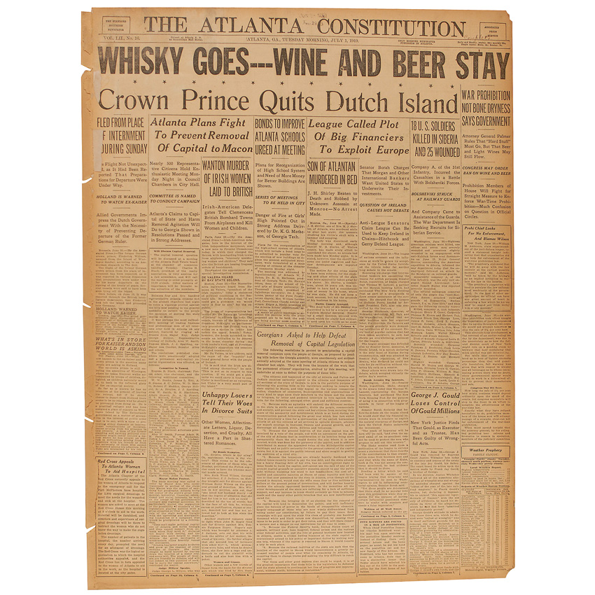 Original Tuesday morning July 1, 1919, edition of The Atlanta Constitution, 16.75 x 22, 20 pages. Large banner headline reads, “Whiskey Goes—Wine and Beer Stay,” with several smaller headlines above the one column article including “War Prohibition Not Bone Dryness Says Government,” and “Attorney General Palmer Rules that ‘Hard Stuff’ Must Go, but that Beer and Light Wine May Still Flow.” In very good condition, with torn binding holes to left edge, fragile binding and pages, chipped edges and corners, and uniform toning.