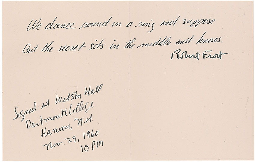 Fountain pen signature, “Robert Frost,” on an off-white 6.5 x 4.25 sheet with a couplet added in another hand, “We dance around a ring and suppose/But the secret sits in the middle and knows,” along with a notation indicating that Frost signed it at Dartmouth College in 1960. In fine condition, with a central vertical fold. RRAuction COA.
