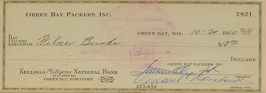 Green Bay Packers, Inc. business check, 8 x 3, filled out in another hand and signed by Lombardi, “Vincent Lombardi,” payable to Green Bay Packers band director Wilner Burke for $18.00, October 20, 1960. Matted and framed with a photo of Jerry Kramer hoisting Lombardi into the air to an overall size of 12.5 x 16.5. In fine condition, with two vertical folds, one through a single letter of signature, and expected cancellation holes and stamps which do not affect signature. Burke served as band director from 1938 to 1981, providing pre-game and halftime entertainment. Pre-certified Steve Grad/PSA/DNA and RR Auction COA.